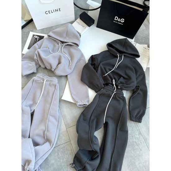 Дуже зручний, теплий і водночас стильний костюм - джогери на високій посадці, з перестрочками, внизу на затяжках, худі укорочене, з капюшоном, внизу регулюється затяжками