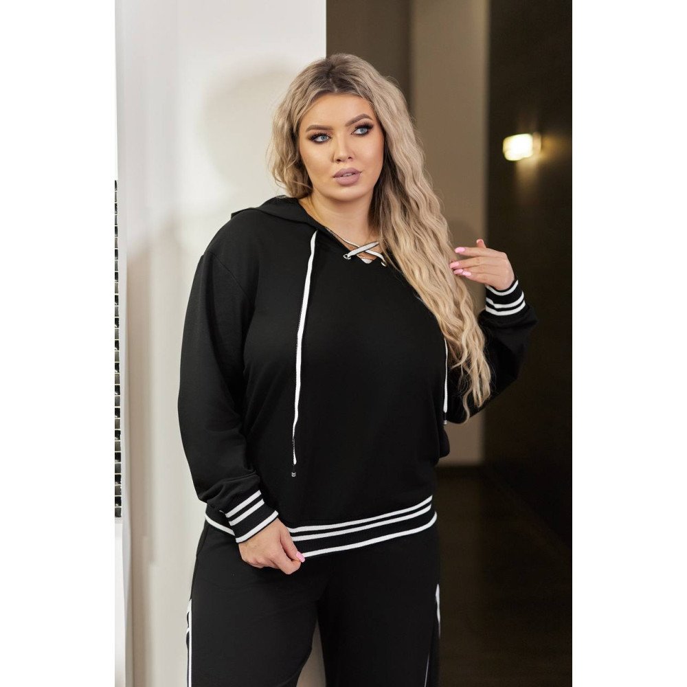 Худі вільного крою з капюшоном, на грудях має шнуровку , низ худі і манжети прикрашені рибаною, штани високої посадки з бічними кишенями, вільного крою.
